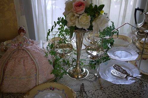 変わった形のケーキスタンドも、大小オパレッセントガラスのプレートを乗せると、高原の春霞の様でございます。