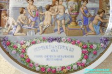 ひと言 | フィリップ・ローゼンタールlは、17歳でアメリカに出発し、食器洗い機から磁器のセールスマンに昇進しました。 1879年にドイツに帰国した際、バイエルン州ゼルプのエルカースロイト城で磁器絵付け業を設立し、会社の基礎を築きました。 「 REIMBOLD & STRICK Köln Fabrik Chemisch-Keramischer Erzeugnisse 」とは、「 ラインボルド&ストリック社 ケルン 化学製磁工場 」という意味です。 ラインボルド&ストリック社は、ライン川沿いのケルンに拠点を置く、現存する、セラミック、ガラス、プラスチック、コーティング等、125年の長きにわたり製品とサービスを提供し続ける革新的で認知されたサプライヤーです。 1896年、カール・ラインボルドとアドルフ・シュトリックにより会社設立。 最初に、当時のエナメルや釉薬に不可欠な不透明剤だった酸化錫が製造され、その後、エナメルや釉薬に不可欠な光学剤となりました。 この社名、工場名を冠した絵皿は、業務概要を一目瞭然にプレゼンした、正に、社運を賭けた一枚でございます。 「ドイツの薔薇」「約束、絆、結びつき、良縁の象徴:リボン」「曙の空」「ケルン大聖堂やホーエンツォレルン橋をはじめとする戦前、被災前、1923年当時のケルンの街並」「ライン川」そして、「業務に勤しむチェラブ達」と見どころ満載。 幅広い業務内容を示す、チェラブ達の作品、一つ一つ見事で、大変見応えがございます。 34cmと大ぶりですので、鮮明で、丸窓から望む風景の様です。 1923年(大正12年)は、9月には関東大震災、10月にはウォルト・ディズニー・カンパニー創立といった出来事の有った年です。 写真では、光が当たり、反射で白光してしまっている箇所がございます。 恐れ入りますが、複数写真にて、お改め下さいませ。 |