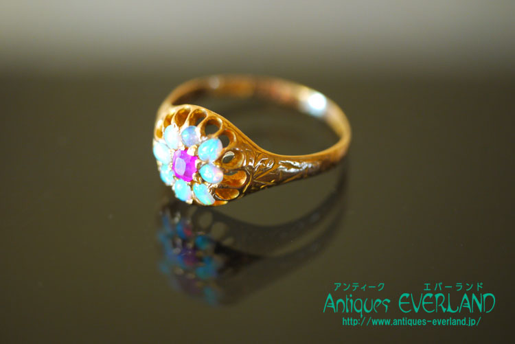 ブルーピンクのルビーを中心に、ブルーやグリーンやオレンジの遊色効果の オパールがデイジーの花弁の様に取り囲み、その周りは、ピアストとなってお り、八重咲きの花の様で、美しく艶やかなハーモニーを奏でるリングです。 横からこの花を眺めると、ぷっくりと膨らんでおり、円い台座、ピアストされた 丸みを帯びた穴、各々のカボションカットされた石・・・女性的・曲線的な雰囲 気づくしでございます。 サイドには、アーカンサスを想わせる葉の模様が入っており、益々以て、植物 のモチーフによる生命の息吹を感じさせられる様に思います。 円やかな、芳醇をイメージさせる、薫り立つ様なルビーです。 ルビーは、その燃え立つ様な紅い色から、古来(石器時代には採掘されてい た様です)より炎や血を象徴する石です。 そのため、情熱や勝利を象徴し、生命力や、富を引き寄せると言われており ます。 見ているだけで元気が出てきて、エネルギッシュになる感じがするのは、そ のせいでしょうか。 そんなパワフルなルビーを優美に見せるのは、ネオンの様に華やかに輝く遊 色効果で、万華鏡やオーロラの様に幻想的・神秘的な境地へ誘ってくれるオ パールです。 オパールは、古代から、虹色に輝くことより「希望の石」「神の石」と尊ばれ、 幸せを招くお守りにされたり、眼病治療にも用いられていた様です。 このリングは、女性が、ふと自分を見失った時、シンプルに、美しい存在であ るという事を思い起こさせてくれ、それを、当たり前の様に受け容れさせてく れる、そんな明るく、華やかな雰囲気を感じさせます。 |