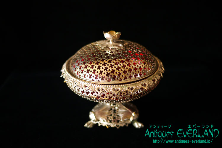 ぱっと目を惹く、華麗で、魅力的なボンボニエールです。 ボンボニエールと申しましても、ピアストバスケットですので、ポプリ容れ、小 物容れ等、他の用途も思い浮かび、とても楽しいです。 写実的な、取っ手部分のクリスマスローズ、獣脚とアーカンサスに加え、幾何 学的な、本体を包む、無数のクロス、見方によっては、四角、そして、縁飾り は、ハートと花の連続模様・・・多種多様なモチーフが用いてあり、不思議な 魅力を放っております。 そして、驚くべきことに、これらの主張の強い、個性的なモチーフが融合し、 美しく、厚みのあるハーモニーを奏でております。 この雰囲気を醸し出すのに、一役買っておりますのは、何と言っても、深く、 華やかな、クランベリーグラスでございます。 何と魅惑的なボンボニエールでしょうか。 ピアストバスケットの隙間から覗くクランベルーレッドが、まるで秘めた情熱の 様なボンボニエールです。 |