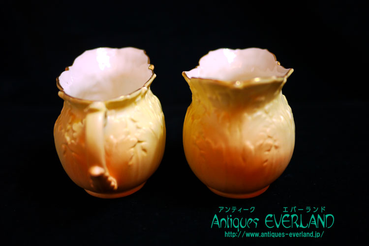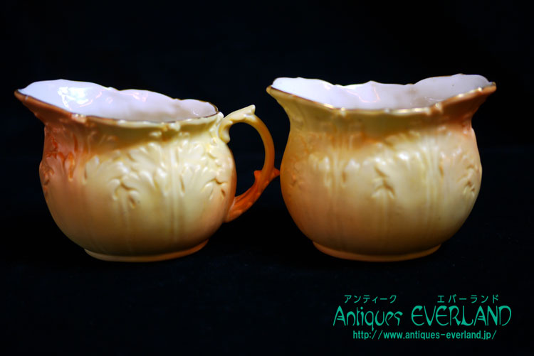 バックスタンプから、1895〜1900年の製作であることが判ります。 当時、既に、ロイヤル ウースターの傘下に入っておりました。 ウースターらしい、やわらかな色合いで、ほんのり色づくグラデーションが見 事です。 円みを帯びたユーモラスな形状で、マットなビスク(内側には釉が掛かってお ります。)が、その雰囲気を更に盛り上げております。 ほっこり、ほんわかした、やさしい雰囲気です。 まるで、アーカンサスの葉に包み込まれるかの彫りが、より、おくるみにくるま れている様な、安寧のまどろみを覚える様に感じます。 アーカンサスは、常緑なので、冬の寒い時期でも大きな葉を付け、年中旺盛 な生命力を発揮しているため、勢いある事の象徴とされて来たそうです。 また、春が来る度に芽吹く事から、キリストの復活を象徴する聖なる植物でも あります。 台座は、円型デザインを多用しており、陶器の放つ雰囲気をより高めておりま す。 また、ミルクピッチャーのハンドルが、上手く嵌り込む様、窪みがございます。 極めつけに感動を覚えましたのは、台座の鏡面が、美しい陶器をやさしげに 映し出し、下からも、ふわりとやわらかな、あたたかみのある光を放つところ でございます。 やさしい、癒しのティータイムとなりそうです。 |