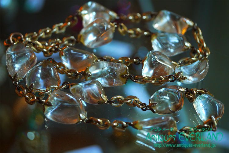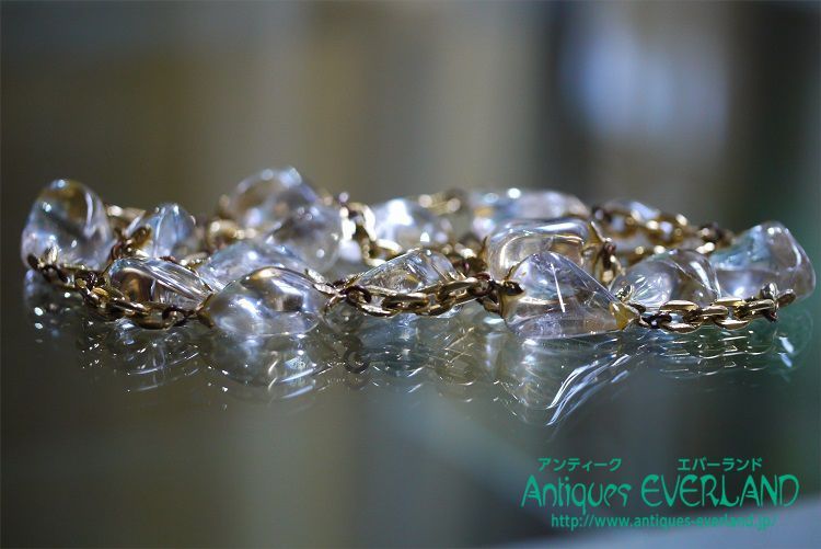ひと言 | まるで水の粒の様な、磨きの掛かった、個性溢れる形をしたロッククリスタルを、直線ラインの刻みの入ったシャープな印象のチェーンが繋ぎます。 |