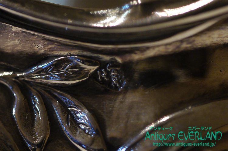 ひと言 | 曲線的な形状をしたシルバーの外枠が、流れる様な曲線と、ハナミズキの様な4弁の花で装飾されております。 内側には、ヴェルメイユが施され、やさしい金色を放っております。 模様は、シルバー面、ヴェルメイユ面、どちらから見ても大変美しく、アール・ヌーヴォー独特の感性が伝わって参ります。 中には、底部に放射状の刻みのある、小さなガラス器が入っております。 手作りのあたたか味を感じさせる、可愛げのあるガラスです。 シルバー枠に、ガラス器を嵌めると、ヴェルメイユの輝きも一層やわらかなものとなり、幾重にも重なる魅力を感じます。 本来は、ソルト ディッシュ(塩入れ)です。 歴史的に、食事に使用する為でなく、装飾として置かれた、美術品としてのソルト ディッシュもございました。 現代では、その他調味料入れや、インテリアと見せかけつつ、外したアクセサリー置きにしたり、香立にしたり、色々と楽しい用途が浮かびます。 |