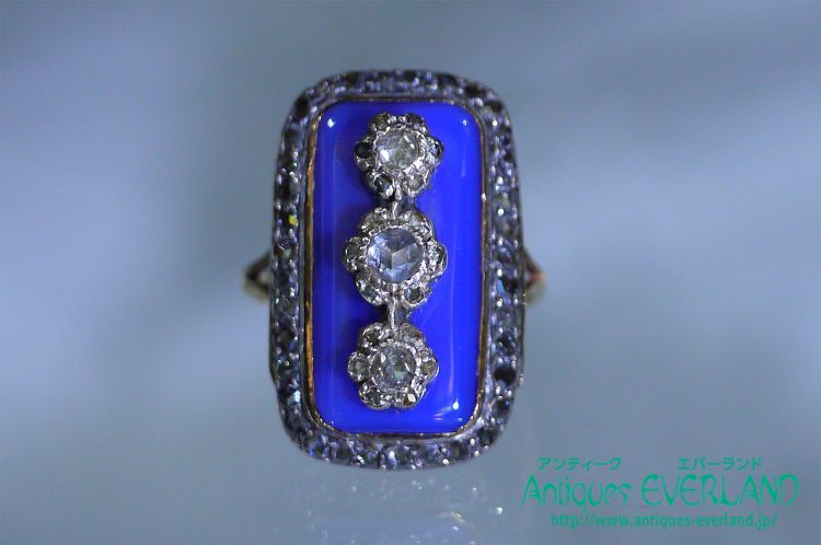 ひと言 | 当リングは、19世紀末の「ジョージアン様式ブーム」の際に、イギリスで作られたものと思われます。 特徴としては、ジョージアン様式の魅力が前面に出ておりますが、シャンクの作りはすっきりすらりとした19世紀末乃至20世紀初頭に作られたデザインです。 当時、古き良き時代への憧憬からデザインを起こし、その時代の使い勝手に合った装着感を追求した様が伺えます。 紫味の青い部分は、エナメルではなく、とろ〜んとした寒天質の様な、半透明な雰囲気を感じさせる、天然石アゲートです。 アゲート独特の、包み込む様なあたたか味がデザインに生きております。 また、色合いは、紫青に、ほんのりグレーを落とした様なアゲート特有の表情が現われ、魅力的です。 さて、長四角のアゲートの上には、お花が3つ縦に連なっております。 各々立体的な花型の石座の中心に、大きな“薔薇の蕾の様な尖った六角錐のローズカット”ダイヤ、その周りを小さなダイヤが取り囲み、ふっくら可愛らしいです。 アゲートの外枠には、ゴールドが輝き、深い色味に花を添えております。 ギャラリーには、36石ものダイヤが、電光石火の如くキラキラ煌きます。 裏面には、フラワリーな彫刻が施され、自分だけの秘密の様で、ウキウキ致します。 ボリュームがあり、華やかながら、指の形に沿った形状で、指馴染みが良いのも魅力の一つです。 『宝石鑑別書』には、下記事項が明記されております。