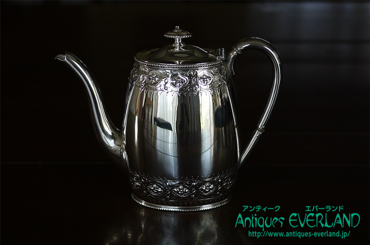 ひと言 | コーヒーポット(ホットウォーターポット)、ティーポット、ミルクピッチャー、シュガーボウルがトレイに収まり、統一感が有り、可愛らしいです。 全ての品の形状が、ツマミに至るまで、オーバル型で、早乙女の様な初々しい女性らしさを感じさせます。 オーバル型の湾曲具合から生じる、滑らかな鏡面に映り込む世界がとてもマジカルです。 その鏡面の美しさを生かしつつ、立体感のある凝ったレース模様がテープの様に刻まれております。 縁周りには、つぶつぶとミルグレインの様に連続しております。 唯一、トレイのみハンドル付け根に“魚”が付いております。 魚は、キリストの象徴です。 使い勝手の良いスモールサイズです。 |