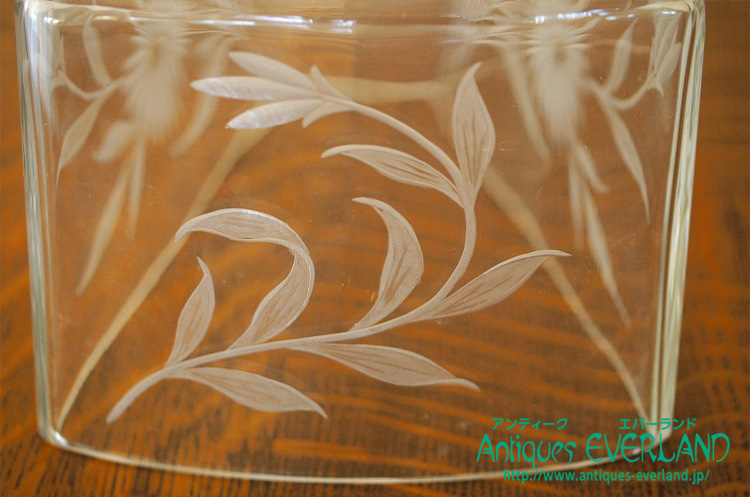 ひと言 | 花が風にそよいでいる・・・そこに別次元の空間があるかの様に感じさせるものは、 実は、実用品:チーズケースでございます。 これ程美しいチーズケースがあるものか、と匠の技に感動致しました。 取っ手は、円みのある花弁を持つ花に、きゅっと閉じた蕾がひっそりと隠れ、スペード型の葉が2枚被さり、よく出来た立体で、まるで生きている様でございます。 可憐なデザインが、シルバーで、クールに輝いております。 本体のガラスには、上面と側面3面に、繊細なエングレービング(グラヴュール)が施され、草花がたおやかに靡いております。 上面と小さな側面には、すっきり、すらりとした蕾、葉、茎。 大きな側面2面には、それに加えて、なんと24弁の花が白く、伸びやかに、輝いております。 葉脈や、花弁の質感までも表現され、生き生きしております。 この美しさも、トレイの力添えが物を言います。 4つ角の5山の波型、それを結ぶ4辺の中心の2箇所の凹みから成る、面白味のあるフリルがエレガント。 トレイの明るい光輝きが、ガラスのエングレービング(グラヴュール)を益々際立たせております。 |