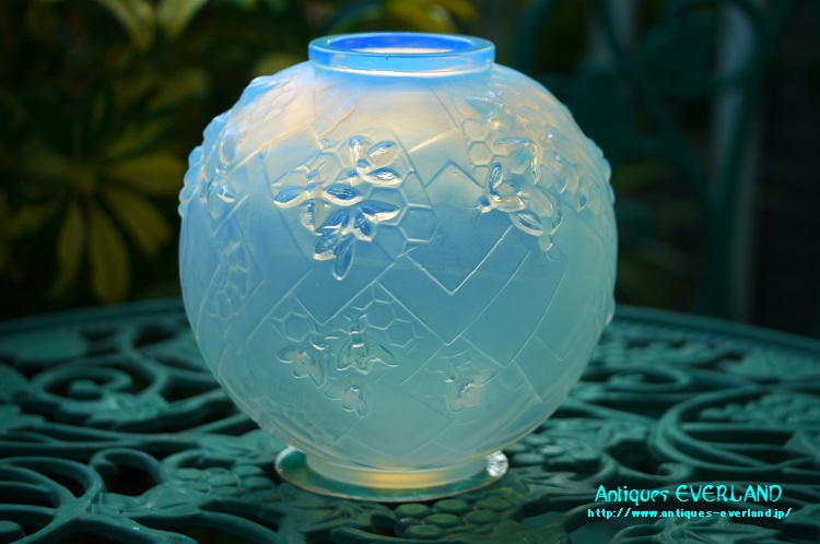 ひと言 | マリウス アーネスト サビーノがパリにて創業し、アールデコのランプからシャンデリアまで、また、花瓶、フィギュリンや動物を様々な質感のガラスで製作致しました。 また、商業施設の調光技師としての職務も果たし、正に、光のデザイナーといったところでしょうか。 夕刻の屋外にて、日光の当たる角度を変え、透過光、反射光とも撮影致しました。 オパレッセントガラスですので、光線の影響で、乳白色が、ブルーやオレンジ色に変化し、浮世離れした美しさです。 地球や月を想わせる形状も手伝って、マットな質感に、柔らかに反射される光は、幻想的・神秘的です。 ナポレオンも重用し紋章にまでした、蜜蜂モチーフに、beehive(蜂の巣)、honeycomb(六角形)パターンも見られ、蜂好きさんにはたまりません。 アールデコで、クールビューティーに纏まっております。 電球を用い、然るべき仕掛けをして、照明になさっても素敵かと存じます。 |