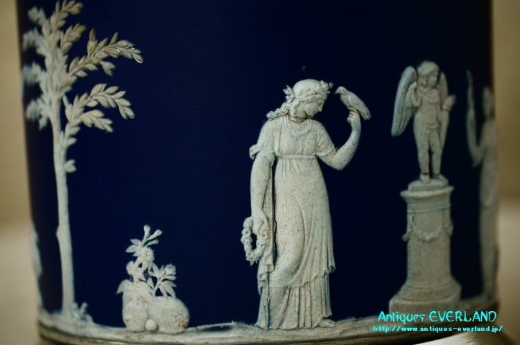 ひと言 | 現在では、僅かに生産されるのみのロイヤルブルーのジャスパーウェアです。 しかも、現在は、ソリッドカラーと呼ばれる、胎土に色素を含ませたものが主流ですが、当ティーポットは、胎土に色素を含ませず、外面を青等の色で覆ったディップドカラーと呼ばれる初期作品です。 本体内側のみ、光沢ある釉薬にて仕上げられています。 シルバーの装飾は、マットなジャスパーウェア特有の風情に、キラリ輝く対極のイメージを加え、同時に高級感を添えます。 実際の色味は、落ち着いたロイヤルブルーですが、レンズを通すと、鮮やかに明るく写ってしまいます。 カメオの様な絵柄の様子をよくお伝えすべく、モードを変えてズームしてみましたので、ご堪能下さいませ。 古代ギリシャ・ローマ美術の形状や装飾をモチーフにすることの多いジャスパーウェアですが、当ジャグでも、物語がドラマティックに展開しております。 同柄のティーポット http://www.antiques-everland.jp/product/703 とお揃えになりますと、一層素敵なティータイムになりますこと請け合いでございます。 |