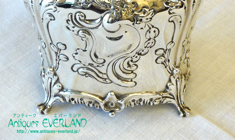 ロココ様式の女性らしいフォルムに、ぷっくりとしたぬくもりの有る草花 の浮彫、獣足、その優美な雰囲気の中に、 動きの有るデイジーの取っ手が茶目っ気を加え、美しくも楽しいティー キャディーです。 蓋は、着脱可能な嵌め込み式で、しっかりと閉まります。 |