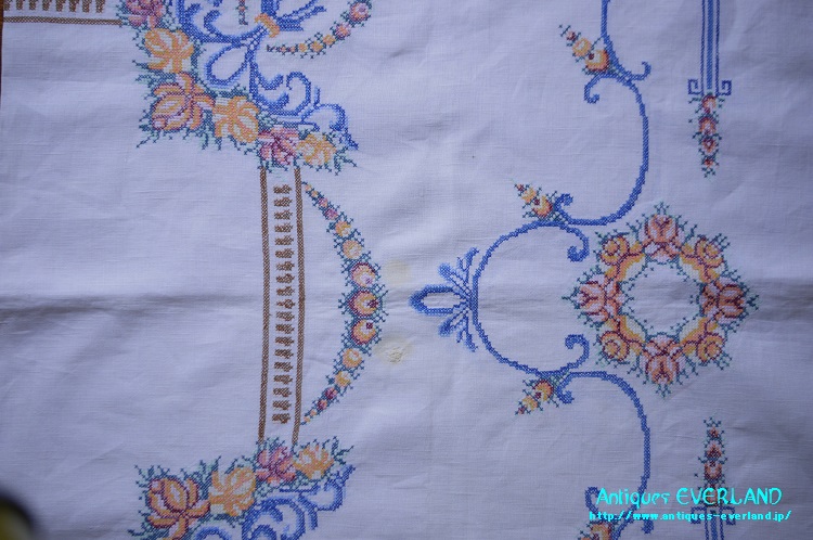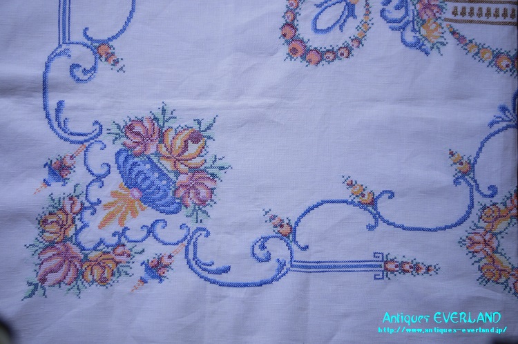 | ひと言 | 心豊かで楽しいティータイムのために、パッと気分の明るくなるテーブルクロスとナプキンをご紹介申し上げます。 とは言え、現代におかれましては、心の赴くままに、爽やかな朝食に用いられても宜しいかと存じます。 しっかりとした生地厚のリネンに、「クロスステッチの鬼」と評したくなる様な、ここまでクロスステッチで、一目一目刺したのかと感動する、スケールの大きな、圧巻の刺繍が施されております。 花籠、花綱、花輪・・・スクロールと、豊かさと繁栄を象徴する、縁起の良い模様が、華々しく、満ちております。 糸は、少なくとも、緑系(ビリジアン、ライトグリーン、ミントグリーン)、黄系(イエロー、アプリコット)、赤系(フューシャ、ピンク、パステルピンク)、紫系(ワイン、モーヴ)、青系(マリンブルー、アジュールブルー、スカイブルー)、茶系(ブラン、ベージュ)、白と、実に多色使いで、色彩を立体的に感じ、また、色彩の妙で、活気を感じます。 正方形、長方形のテーブルに、向きを変えて2種類、オーバル型のテーブルにも素敵です。 なお、何分にもアンティークの布製品でございますので、ご理解のお有りになる方にお薦め致します。 |
