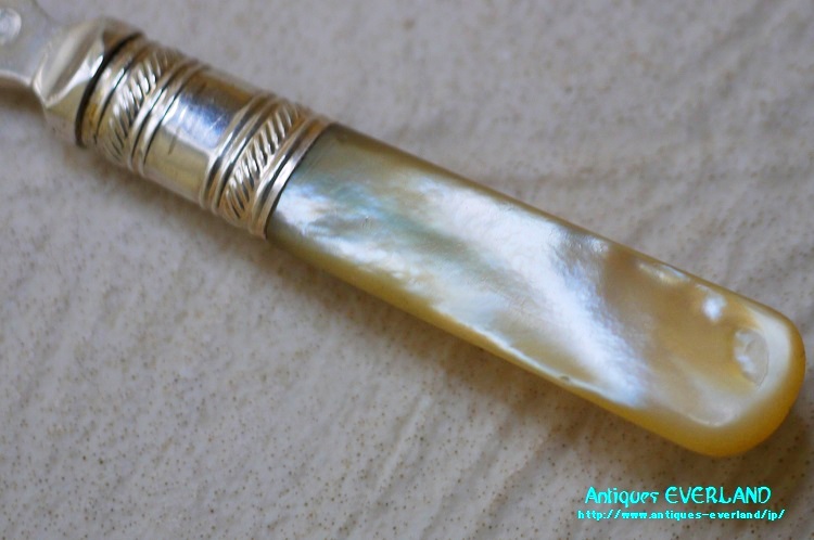 ひと言 | 優れた道具とは、用途以外の効果も齎すもので、使うそばから動作までも、その方ご自身までも美しく魅せてくれるものです。 当時イギリスでは、1つの動作につき、1つの道具が用意されたものですが、本来、こちらはジャム専用のスプーンです。 虹色に輝くマザーオブパールは、年月をかけて真珠を作り出す母貝ですので、母なる自然の神秘的な美を感じさせます。 さり気ない模様をよく観察致しますと、興味深い道具を使い分け、可憐な模様を成していると見て取れ、その小さな世界に魅了されます。 現代におきましては、お好みでコレクションなさりまして、ジャム以外の用途にも。 |