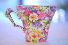 ひと言 | 一目で心華やぐチンツ柄。 場の雰囲気を、明るく上げてくれます。 1934年発表された“Du Barry”パターンは、時代を経て、たくさんの方々の心を明るく照らす、人気の柄です。 ティーポット、ミルク&シュガーセットは、ダイヤモンドと呼ばれるシェイプで、テーパードしたスクエアシルエットは、スタイリッシュです。 同じ様にテーパードしたカップと共に、大変エレガントで、素敵です。 ティーポットの注ぎ口とハンドルには、花柄のエンボス加工が施されております。 ワインレッドの縁周りは、可憐なチンツ柄に、熟れた果実の様な色気を、ふと、感じさせます。 ティーサービスセットですので、お花畑に座り込んだような、立体で感じ取る明るい世界です。 貫入の見受けられるカップが、2客ございます。 |
