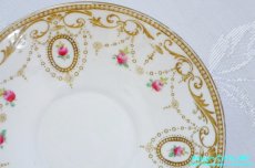 ひと言 | アール・デコへと向かう時期の作品で、既に、その美意識が込められております。 すっきりしたシェイプに、シックなセピア色で、心奪われるパール、スクロール、スノードロップ、チェーン、シァンデリアの様な、文様が入っております。 メダリオンの中には、鮮やかな手彩色の薔薇が際立っています。 後期Foley期の作品で、New Yorkシェイプです。 ワイルマン家がオーナーのthe Foley worksでしたが、1910年頃“Foley”という名称を巡り訴訟が提起され、敗訴の末Shellyに名称変更する前の貴重な作品です。 |